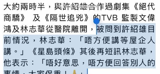 有记者在医院门口拍到苗侨伟戚美珍夫妇现身,还有许绍雄的好朋友黎芷珊、TVB监制文伟鸿及林志华等人,也都被拍到前往医院探望许绍雄。